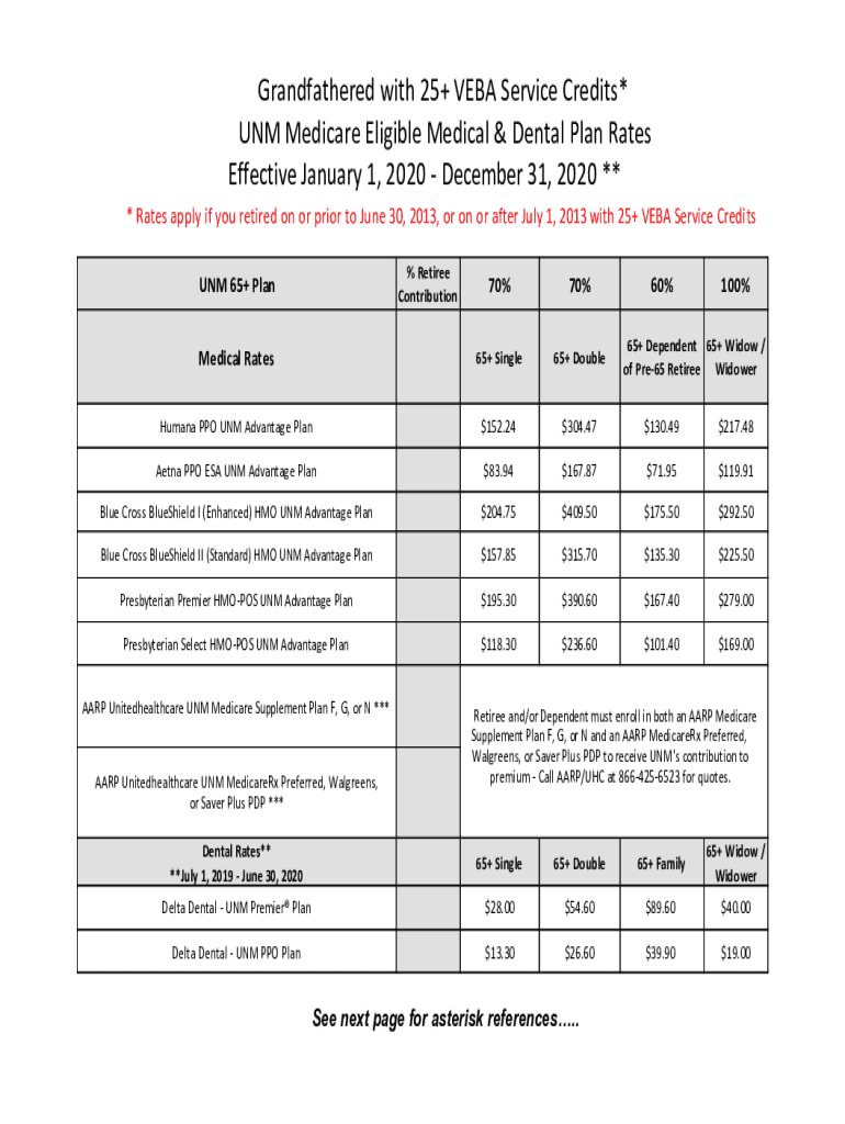 Grandfathered with 25+ VEGA Service Credits* UNM Medicare Eligible Medical & Dental Plan Rates Effective January 1, 2020, December 31, 2020 ** * Rates apply if you retired on or prior to June 30,