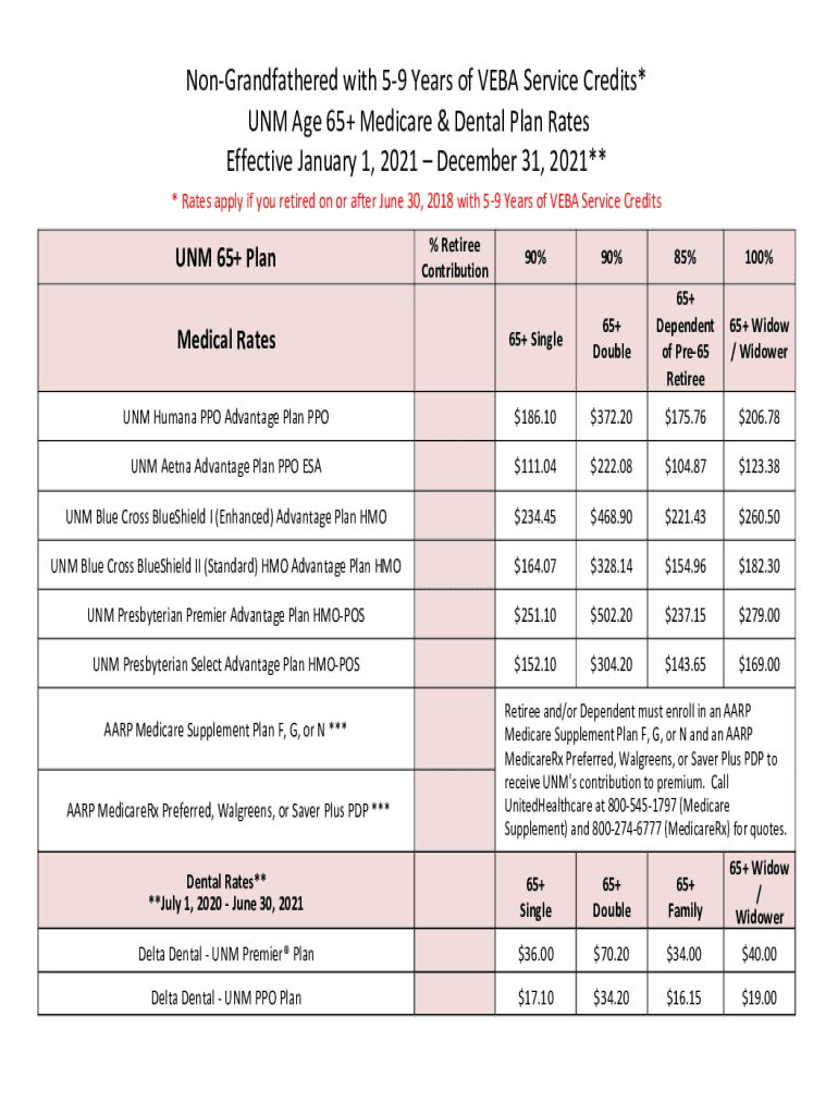 Grandfathered with 59 Years of VEGA Service Credits* UNM Age 65+ Medicare & Dental Plan Rates Effective January 1, 2021, December 31, 2021** * Rates apply if you retired on or after June 30, 2018,
