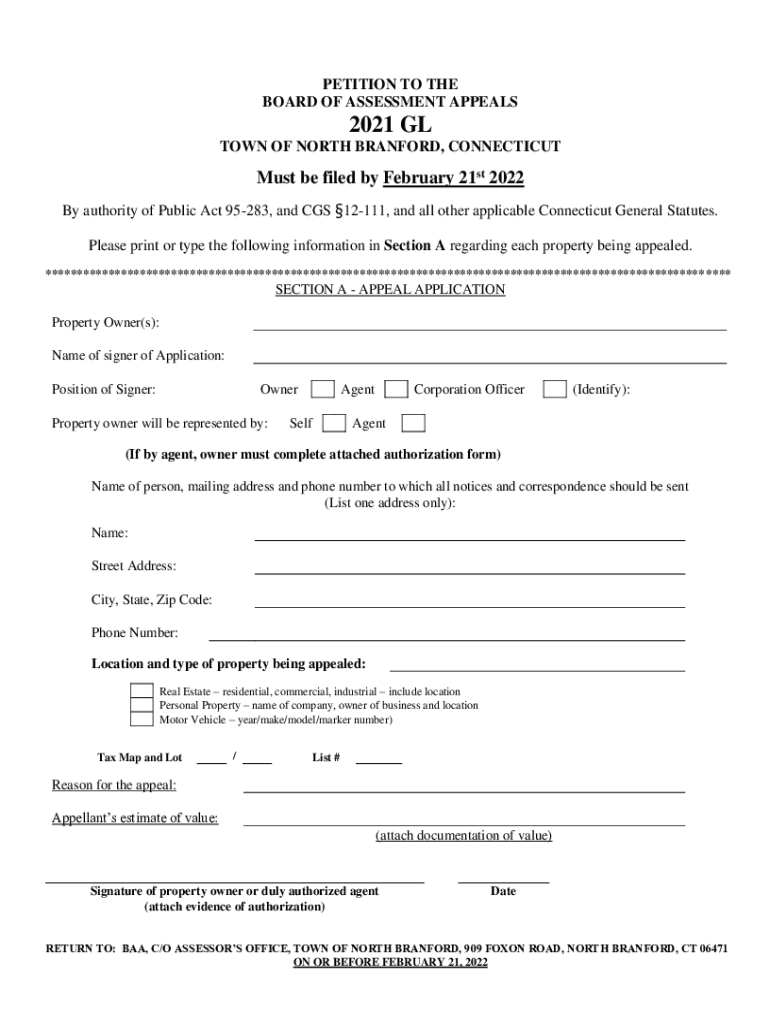 PETITION TO THE BOARD OF ASSESSMENT APPEALS2021 GL TOWN OF NORTH BRANFORD, CONNECTICUTMust be filed by February 21st 2022 By authority of Public Act 95283, and CGS 12111, and all other applicable