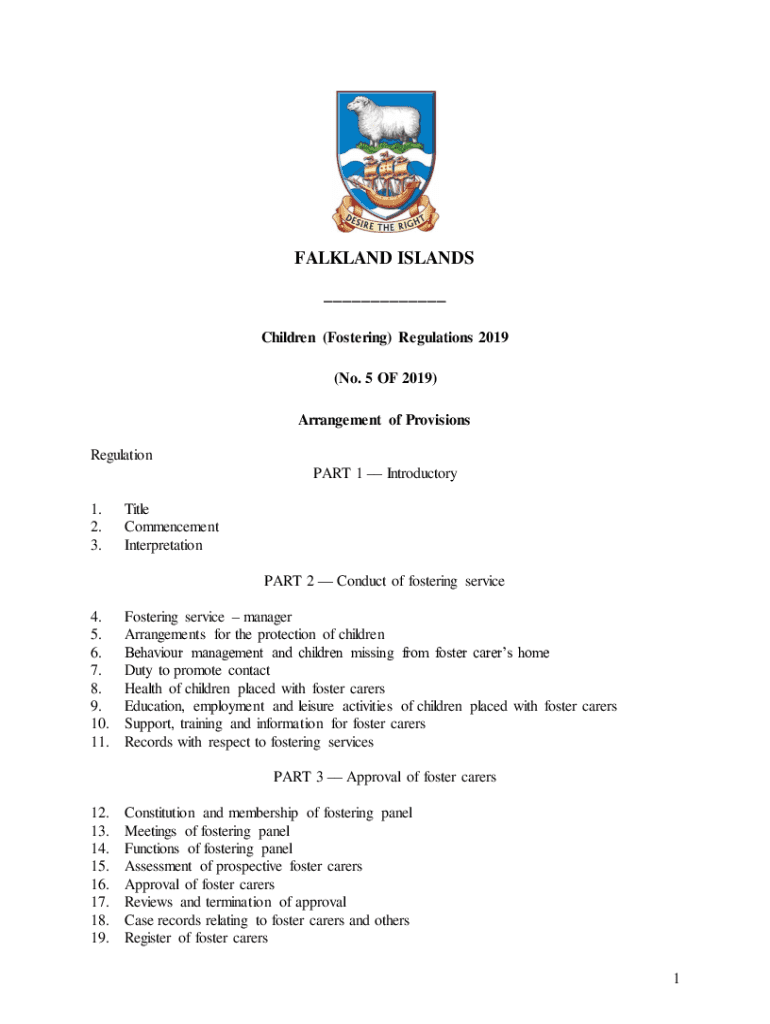 FALKLAND ISLANDS ___ Children (Fostering) Regulations 2019 (No. 5 OF 2019) Arrangement of Provisions Regulation PART 1 Introductory 1. 2. 3. Title Commencement Interpretation PART 2 Conduct of fostering