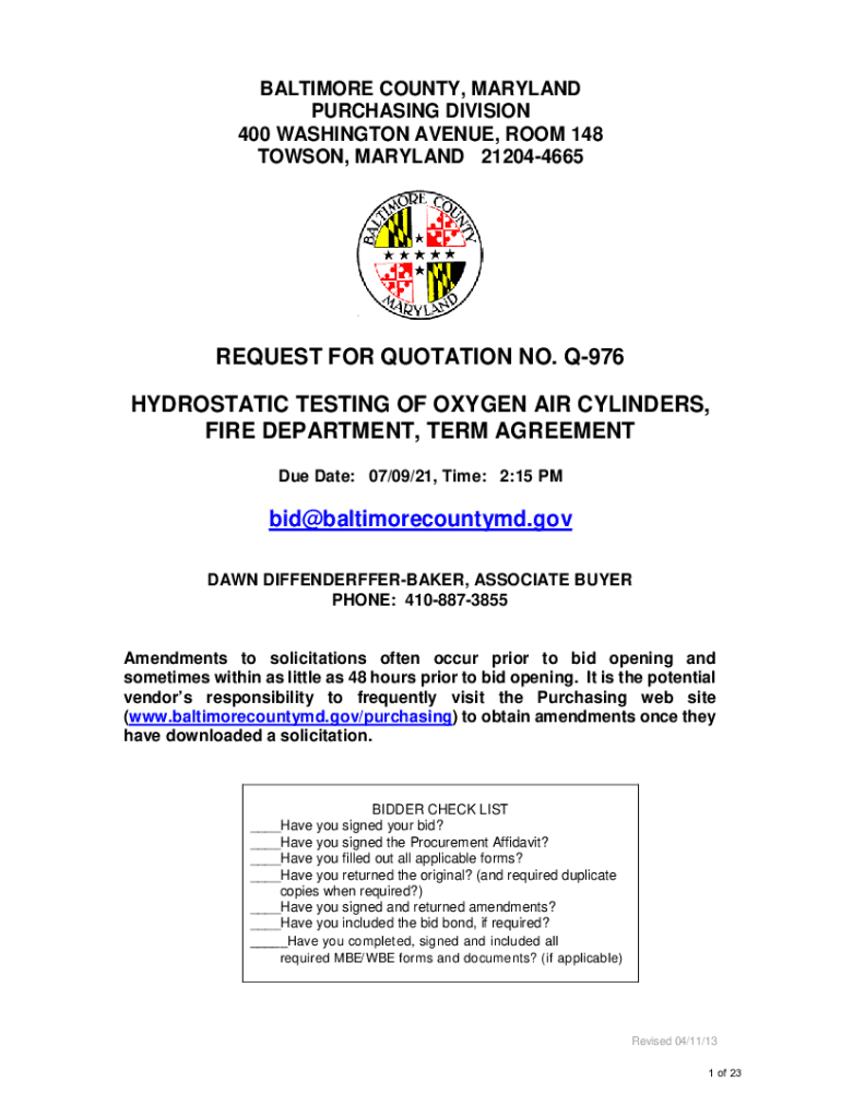 BALTIMORE COUNTY, MARYLAND PURCHASING DIVISION 400 WASHINGTON AVENUE, ROOM 148 TOWSON, MARYLAND 212044665REQUEST FOR QUOTATION NO. Q976 HYDROSTATIC TESTING OF OXYGEN AIR CYLINDERS, FIRE DEPARTMENT,