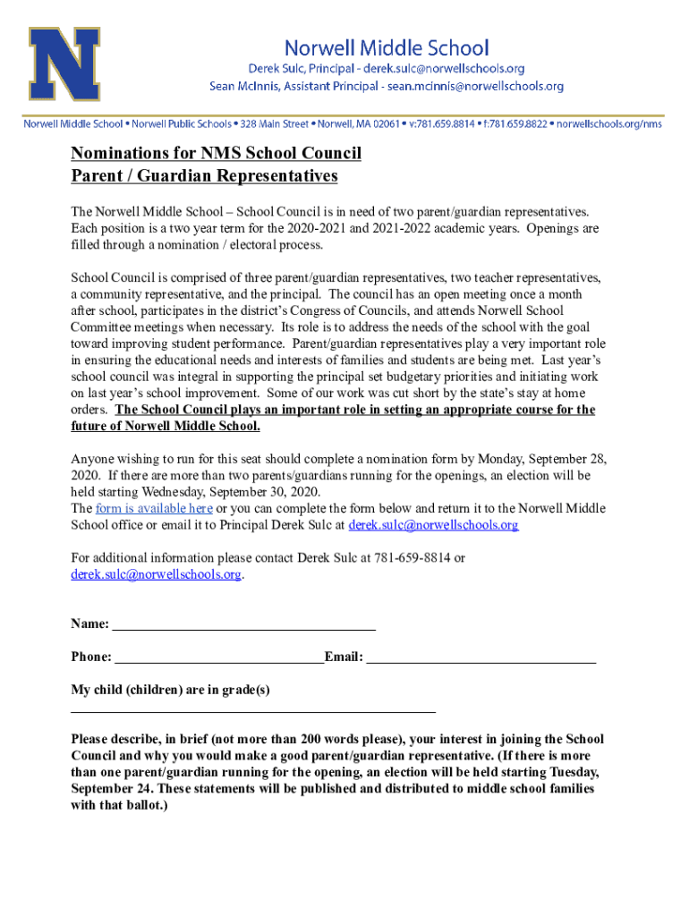 Get the free Nominations for NMS School Council Parent / Guardian ...