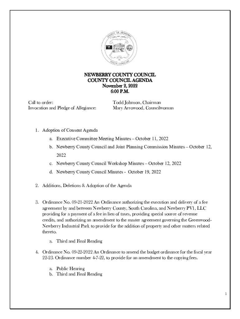 NEWBERRY COUNTY COUNCIL AGENDA November 2, 2022 6:00 P.M. Call to order: Invocation and Pledge of Allegiance:Todd Johnson, Chairman Mary Arrowhead, Councilwoman1. Adoption of Consent Agenda a. Executive