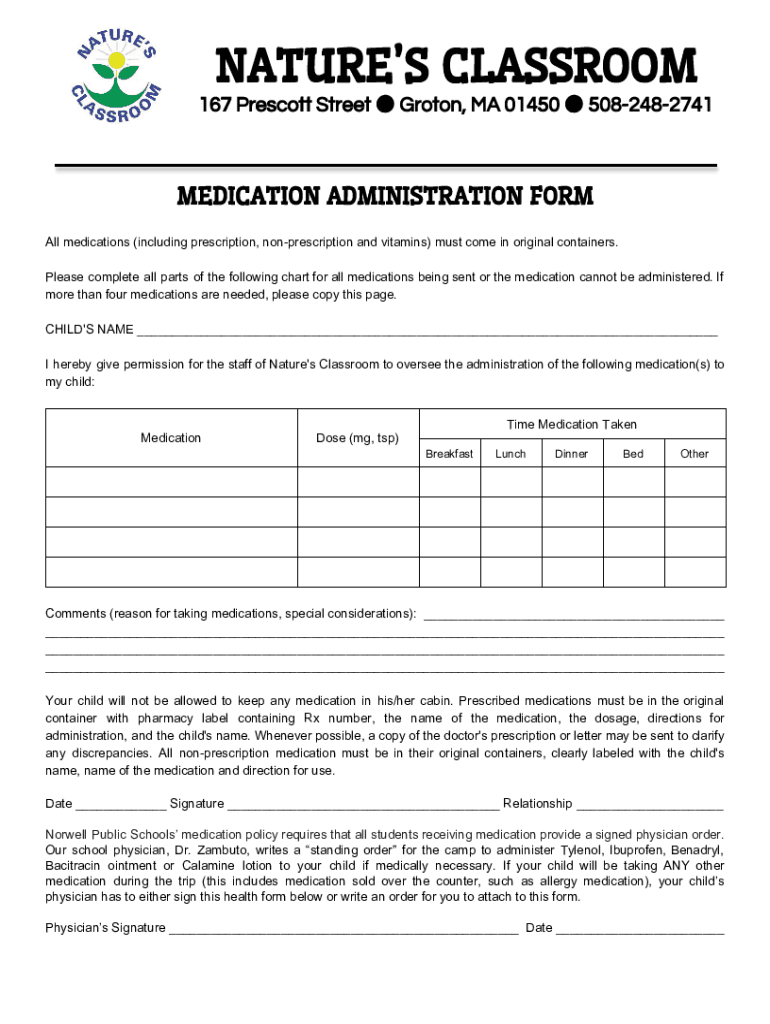NATURES CLASSROOM CLASSROOM167 Prescott Street Proton, MA 01450 5082482741MEDICATION ADMINISTRATION FORM All medications (including prescription, nonprescription and vitamins) must come in original