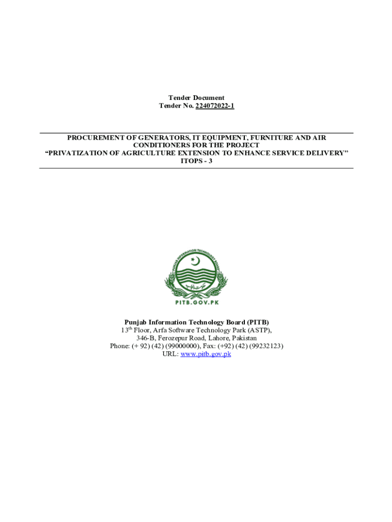 Tender Document Tender No. 2240720221PROCUREMENT OF GENERATORS, IT EQUIPMENT, FURNITURE AND AIR CONDITIONERS FOR THE PROJECT PRIVATIZATION OF AGRICULTURE EXTENSION TO ENHANCE SERVICE DELIVERY STOPS