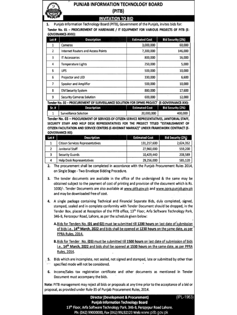 Tender Document Tender No. 1280220221PROCUREMENT OF HARDWARE / IT EQUIPMENT FOR PITS VARIOUS PROJECTS (EGOVERNANCEXVIII)Punjab Information Technology Board (PIT) 13th Floor, Area Software Technology