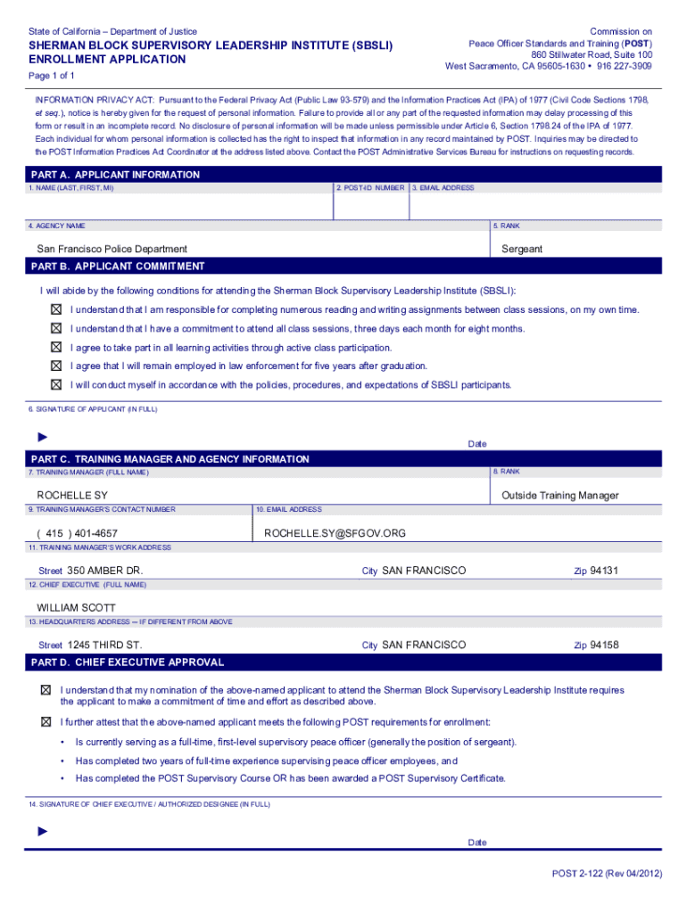 22023 02/28/2022 2022 Application for The Sherman Block Supervisory Leadership Institute (SB SLI) The prestigious Sherman Block Supervisory Leadership Institute is a 8month course offered by POST
