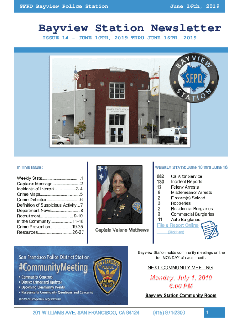 SFPD Bayview Police Station June 16th, 2019Bayview Station Newsletter ISSUE 14 JUNE 10TH, 2019 Through JUNE 16TH, 2019In This Issue: Weekly Stats....1 Captains Message...2 Incidents of Interest.34
