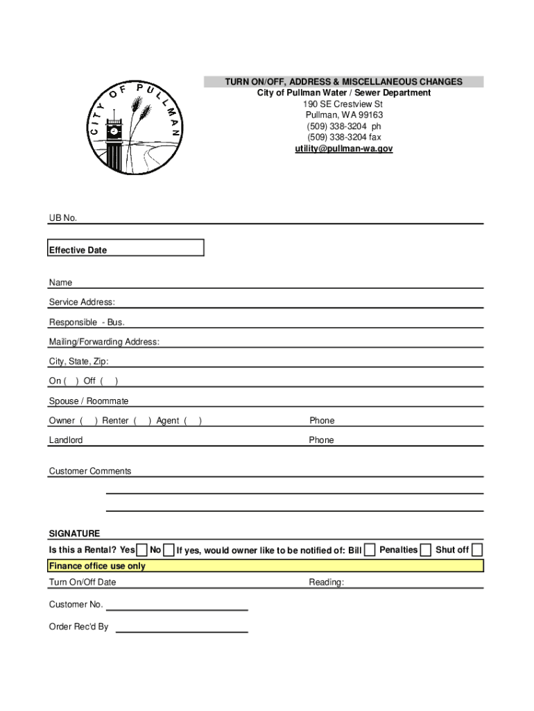 TURN ON/OFF, ADDRESS & MISCELLANEOUS CHANGES City of Pullman Water / Sewer Department 190 SE Crestview St Pullman, WA 99163 (509) 3383204 pH (509) 3383204 fax utility@pullmanwa.govUB No. Effective