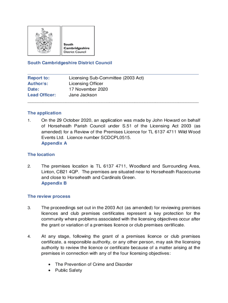 South Cambridge shire District Council ___ Report to: Licensing Subcommittee (2003 Act) Author/s: Licensing Officer Date: 17 November 2020 Lead Officer: Jane Jackson ___ The application 1. On the