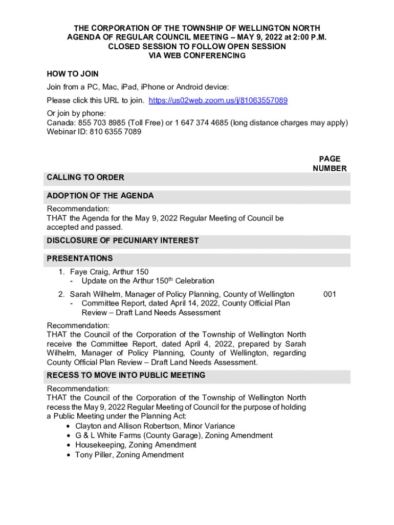 THE CORPORATION OF THE TOWNSHIP OF WELLINGTON NORTH AGENDA OF REGULAR COUNCIL MEETING MAY 9, 2022, at 2:00 P.M. CLOSED SESSION TO FOLLOW OPEN SESSION VIA WEB CONFERENCING HOW TO JOIN from a PC, Mac,