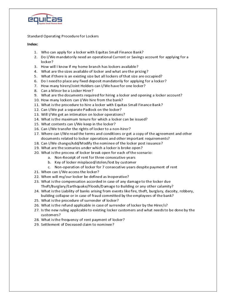 Standard Operating Procedure for Lockers Index: 1. Who can apply for a locker with Equity Small Finance Bank? 2. Do I/We mandatory need an operational Current or Savings account for applying for a
