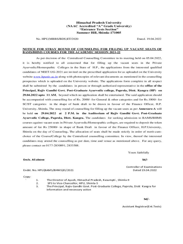 Himachal Pradesh University (NAACP Accredited A Grade University) Entrance Tests Section Summer Hill, Shimla171005 No. CPU(MBBS/BDS)ET/2020Dated. 19.04.2022NOTICE FOR STRAY ROUND OF COUNSELING FOR
