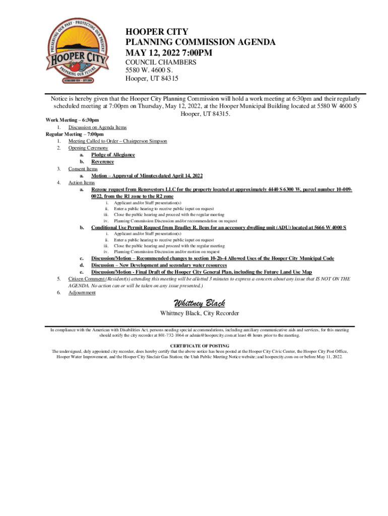 HOOPER CITY PLANNING COMMISSION AGENDA MAY 12, 2022 7:00PM COUNCIL CHAMBERS 5580 W. 4600 S. Hooper, UT 84315 Notice is hereby given that the Hooper City Planning Commission will hold a work meeting