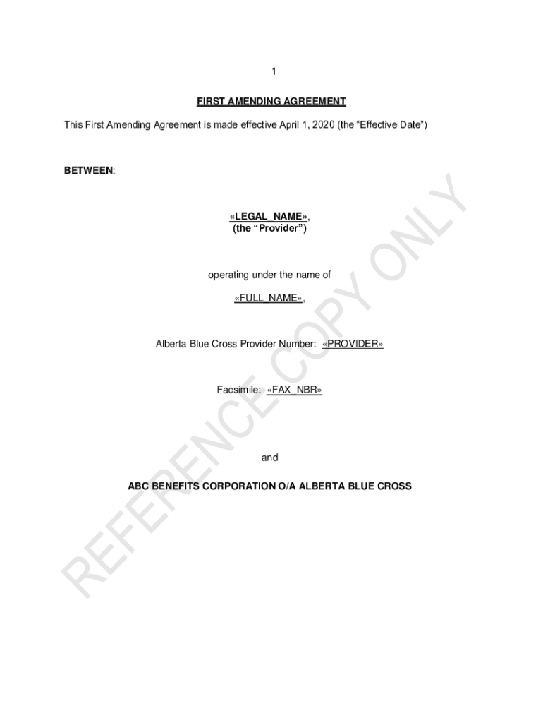 1 FIRST AMENDING AGREEMENT This First Amending Agreement is made effective April 1, 2020 (the Effective Date)BETWEEN:LEGAL_NAME, (the Provider)operating under the name of FULL_NAME, Alberta Blue Cross