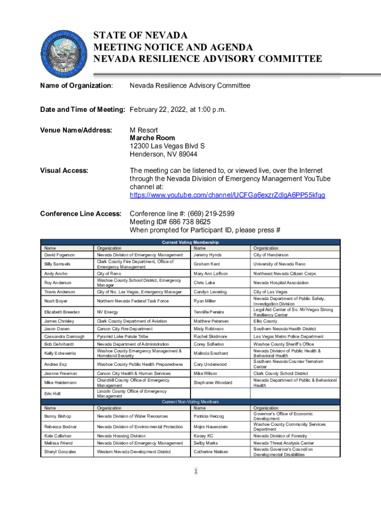 STATE OF NEVADA MEETING NOTICE AND AGENDA NEVADA RESILIENCE ADVISORY COMMITTEE Name of Organization:Nevada Resilience Advisory Committeeman and Time of Meeting: February 22, 2022, at 1:00 p.m. Venue