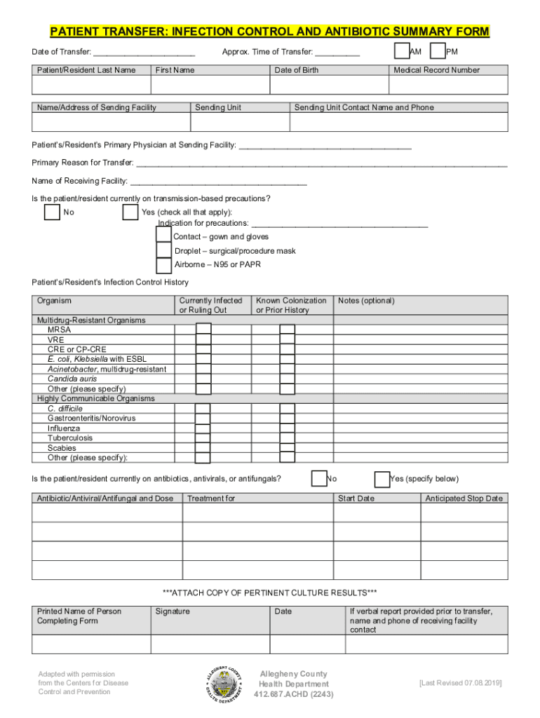 PATIENT TRANSFER: INFECTION CONTROL AND ANTIBIOTIC SUMMARY FORM