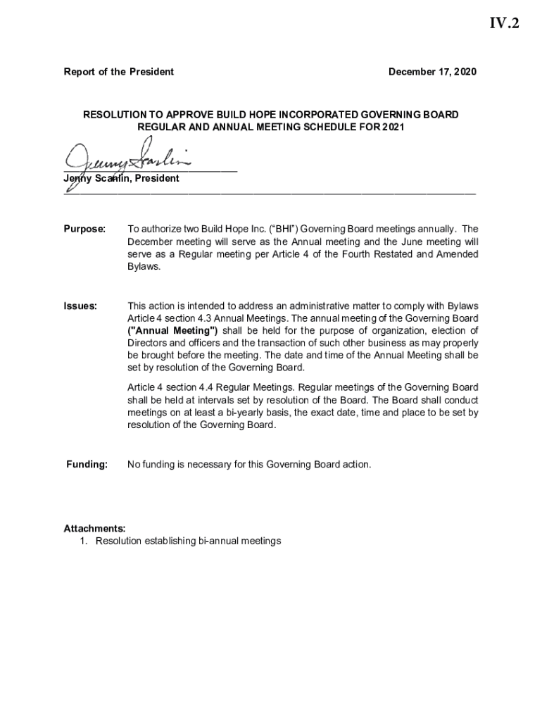 IV.2 Report of the President December 17, 2020RESOLUTION TO APPROVE BUILD HOPE INCORPORATED GOVERNING BOARD REGULAR AND ANNUAL MEETING SCHEDULE FOR 2021 ___ Jenny Stalin, President ___Purpose:To authorize