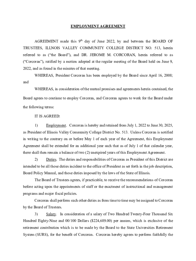 EMPLOYMENT AGREEMENT made this 9th day of June 2022, by and between the BOARD OF TRUSTEES, ILLINOIS VALLEY COMMUNITY COLLEGE DISTRICT NO. 513, herein referred to as (the Board), and DR. JEROME M.