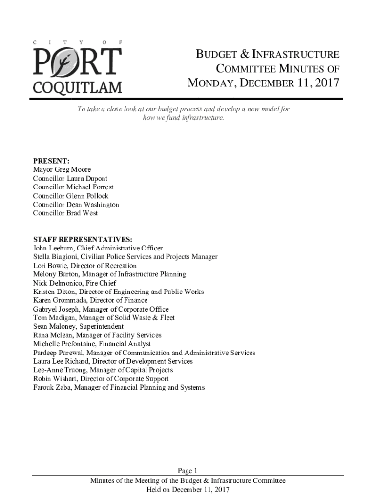 BUDGET & INFRASTRUCTURE COMMITTEE MINUTES OF MONDAY, DECEMBER 11, 2017, To take a close look at our budget process and develop a new model for how we fund infrastructure.PRESENT: Mayor Greg Moore
