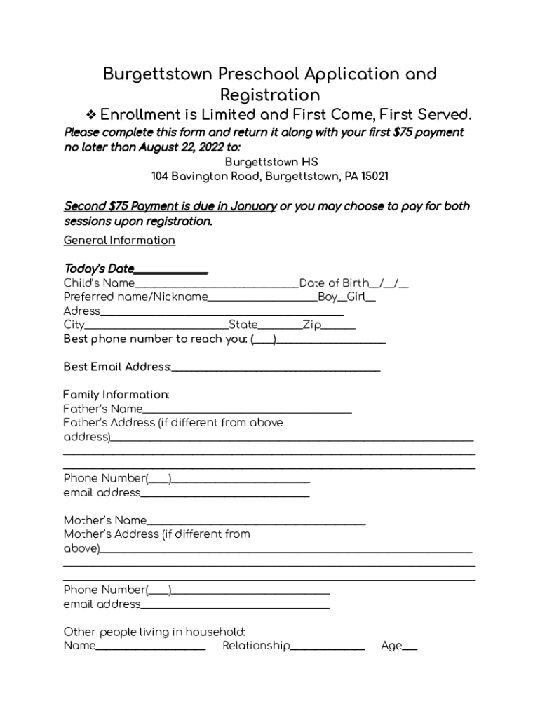 Burgettstown Preschool Application and Registration Enrollment is Limited and First Come, First Served. Please complete this form and return it along with your first $75 payment no later than August