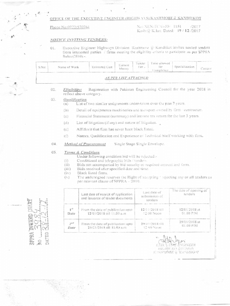 I.OFFICE OF THE EXECUTIVE Engineer (UlGI1 S ASHORE. I BANDIT NT:: N: RG55 1151 12017 Kush:\'\' K.not Dated: 19 / 12 /2017Phone No:0722/570761iVOTIC\'E INVITING TENDERS: 01. C. Executive Engineer Highways