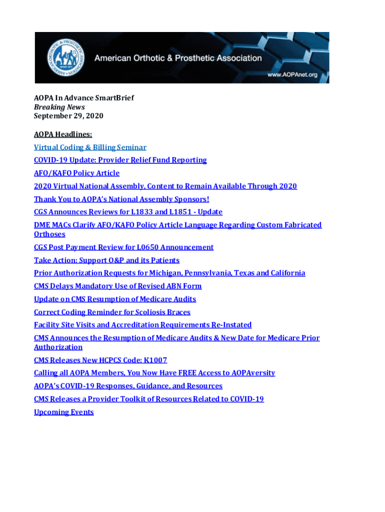APA In Advance Smarties Breaking News September 29, 2020, APA Headlines: Virtual Coding & Billing Seminar COVID-19 Update: Provider Relief Fund Reporting AFO/KARO Policy Article 2020 Virtual National
