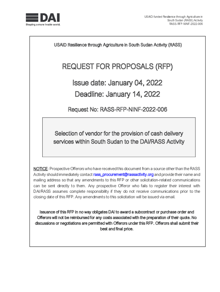 USAIDfunded Resilience through Agriculture in South Sudan (MASS) Activity RASSRFPNINF2022006USAID Resilience through Agriculture in South Sudan Activity (MASS)REQUEST FOR PROPOSALS (RFP) Issue date: