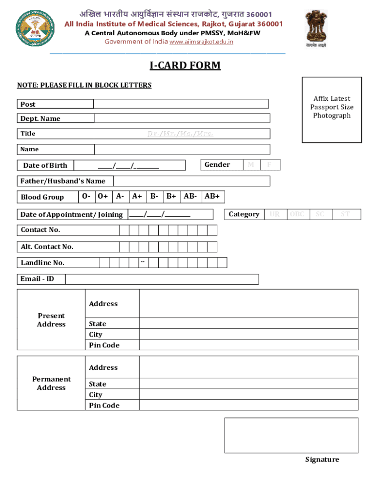, 360001 All India Institute of Medical Sciences, Rajkot, Gujarat 360001 A Central Autonomous Body under PUSSY, Moscow Government of India www.aiimsrajkot.edu.in___ICARD FORM NOTE: PLEASE FILL IN