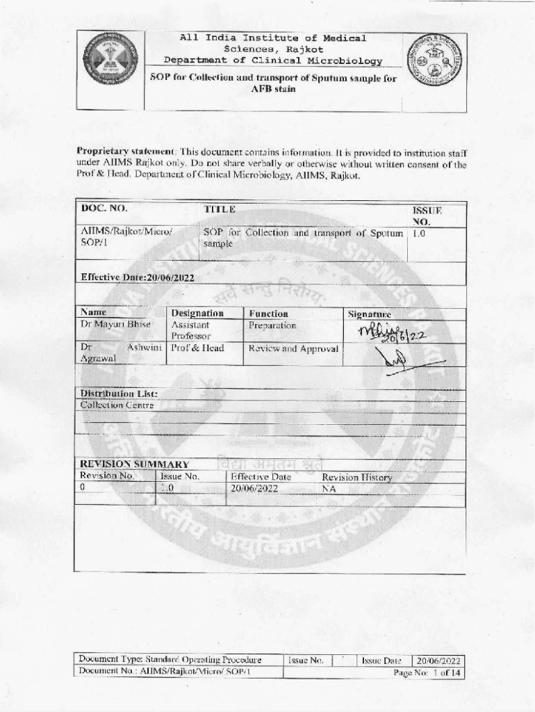 All India Institute of Medical Sciences, Rajkot Department of Clinical Microbiology SOP for Collection and transport of Sputum sample for AFB stain1.0PURPOSE AND SCOPE Purpose of this SOP is to describe