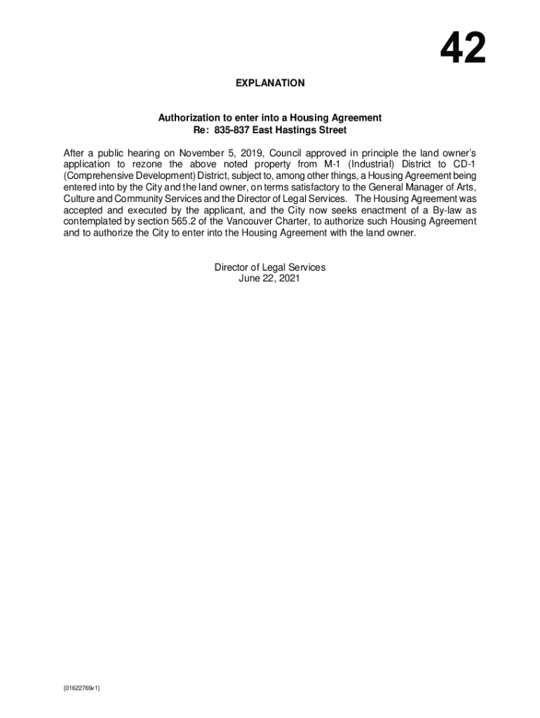 EXPLANATION42Authorization to enter into a Housing Agreement Re: 835837 East Hastings Street After a public hearing on November 5, 2019, Council approved in principle the landowners' application to
