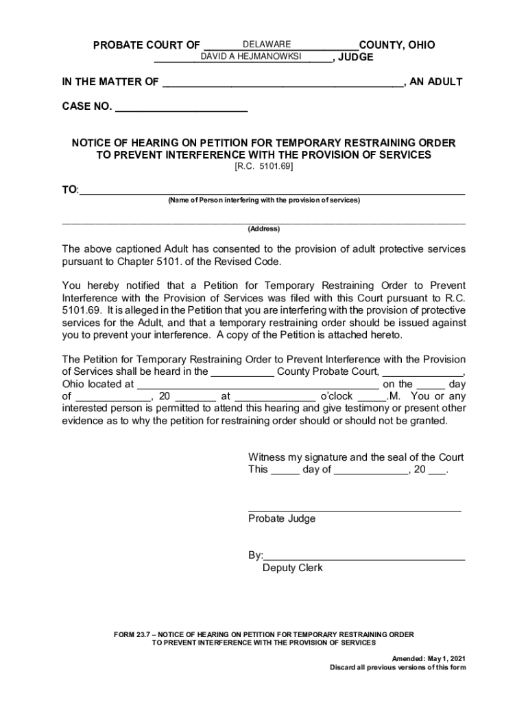 DELAWARE PROBATE COURT OF ___COUNTY, OHIO DAVID A HEJMANOWKSI ___, JUDGE IN THE MATTER OF ___, AN ADULT CASE NO. ___ NOTICE OF HEARING ON PETITION FOR TEMPORARY RESTRAINING ORDER TO PREVENT INTERFERENCE