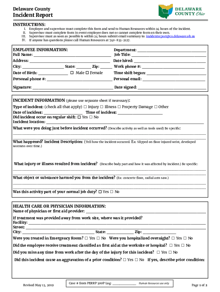 III.IV. Employee and supervisor must complete this form and send to Human Resources within 24 hours of the incident.
