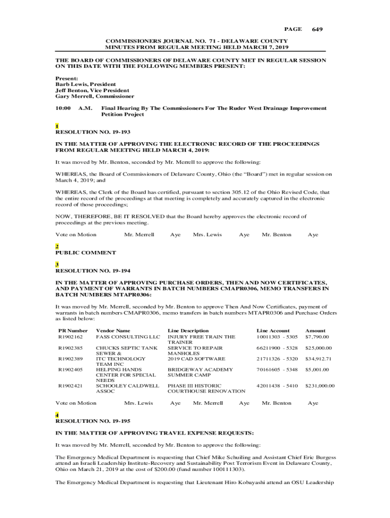 PAGE649COMMISSIONERS JOURNAL NO. 71 DELAWARE COUNTY MINUTES FROM REGULAR MEETING HELD MARCH 7, 2019, THE BOARD OF COMMISSIONERS OF DELAWARE COUNTY MET IN REGULAR SESSION ON THIS DATE WITH THE FOLLOWING