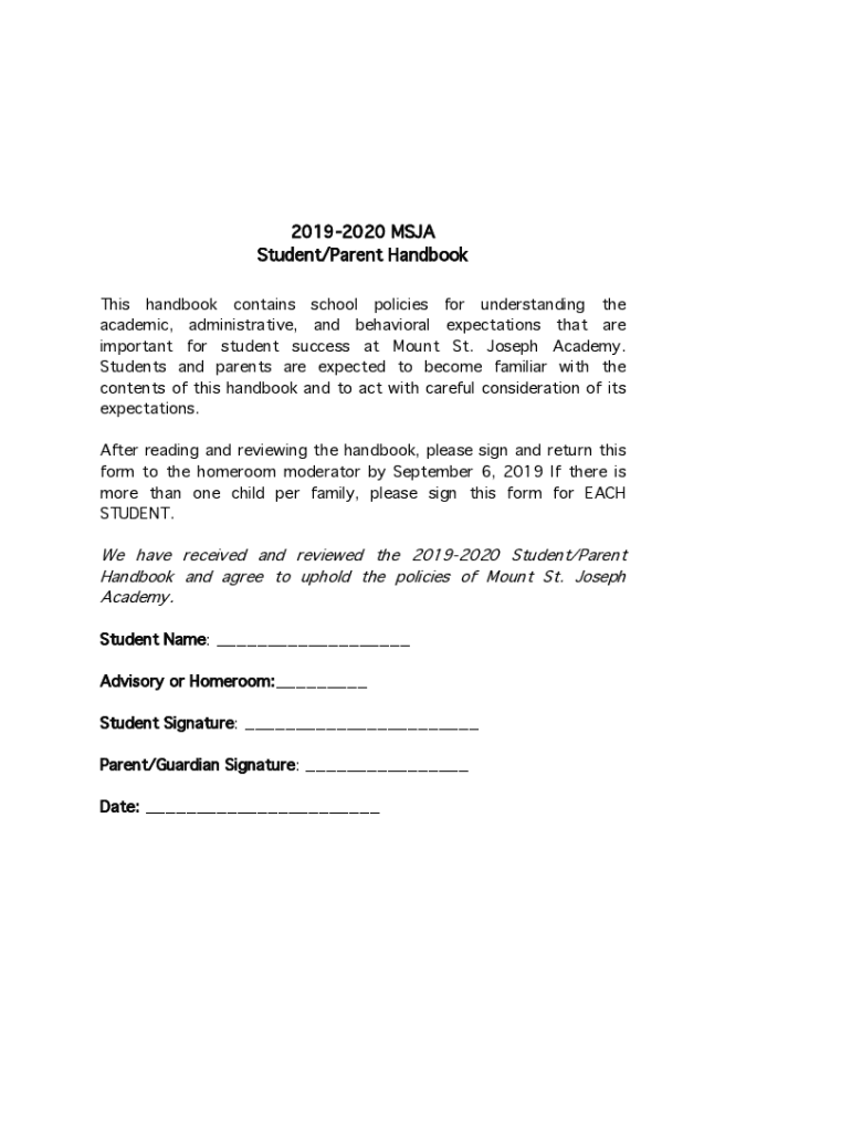 20192020 MSA Student/Parent Handbook This handbook contains school policies for understanding the academic, administrative, and behavioral expectations that are important for student success at Mount