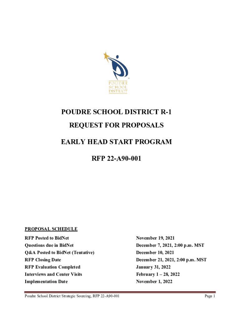 PURE SCHOOL DISTRICT R1 REQUEST FOR PROPOSALS EARLY HEAD START PROGRAM RFP 22A90001PROPOSAL SCHEDULE RFP Posted to Bidet Questions due in Bidet Q&A Posted to Bidet (Tentative) RFP Closing Date RFP