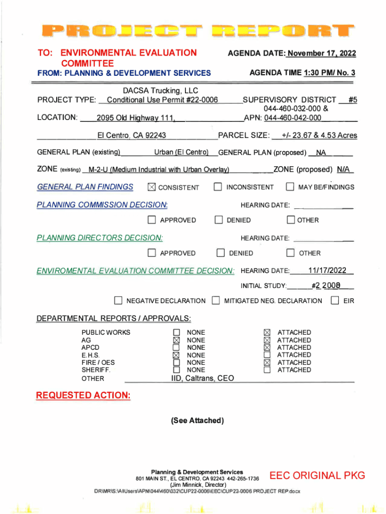 T TO: ENVIRONMENTAL EVALUATION COMMITTEEAGENDA DATE: November 17, 2022, AGENDA TIME 1 :30 PM/ No. 3FROM: PLANNING & DEVELOPMENT SERVICES PROJECT TYPE: LOCATION:DACHA Trucking, LLC Conditional Use