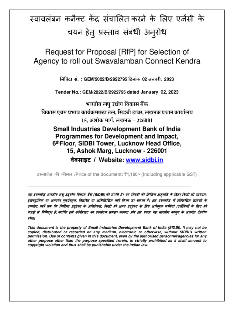 Request for Proposal [RFP] for Selection of Agency to roll out Swavalamban Connect Kendra. GEM/2022/B/2922795 02, 2023Tender No.: GEM/2022/B/2922795 dated January 02, 2023