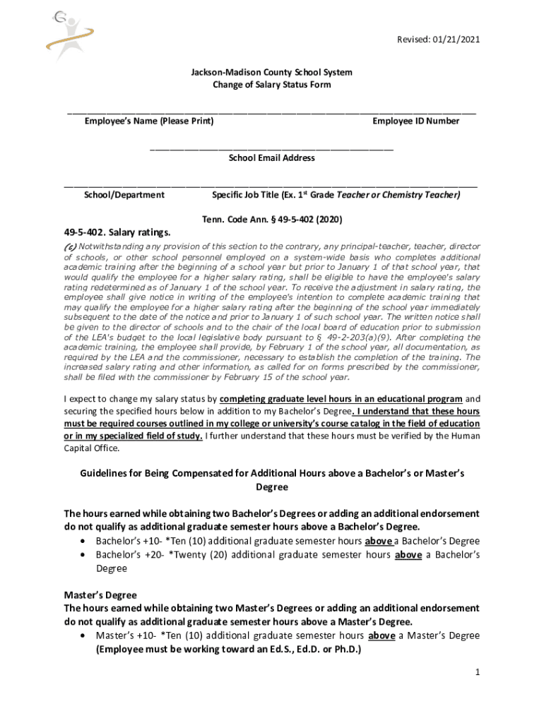 Revised: 01/21/2021 Jackson Madison County School System Change of Salary Status Form ___ Employees Name (Please Print) Employee ID Number ___ School Email Address ___ School/Department Specific Job