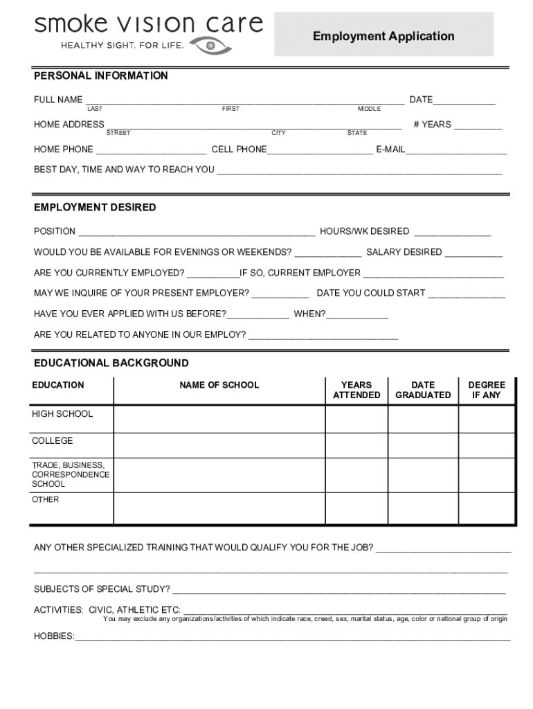 Employment Application PERSONAL INFORMATION FULL NAME ___ DATE___ LASTFIRSTMIDDLEHOME ADDRESS ___ STREETCAR# YEARS ___STATEHOOD PHONE ___ CELL PHONE___ EMAIL___ the BEST DAY, TIME AND WAY TO REACH