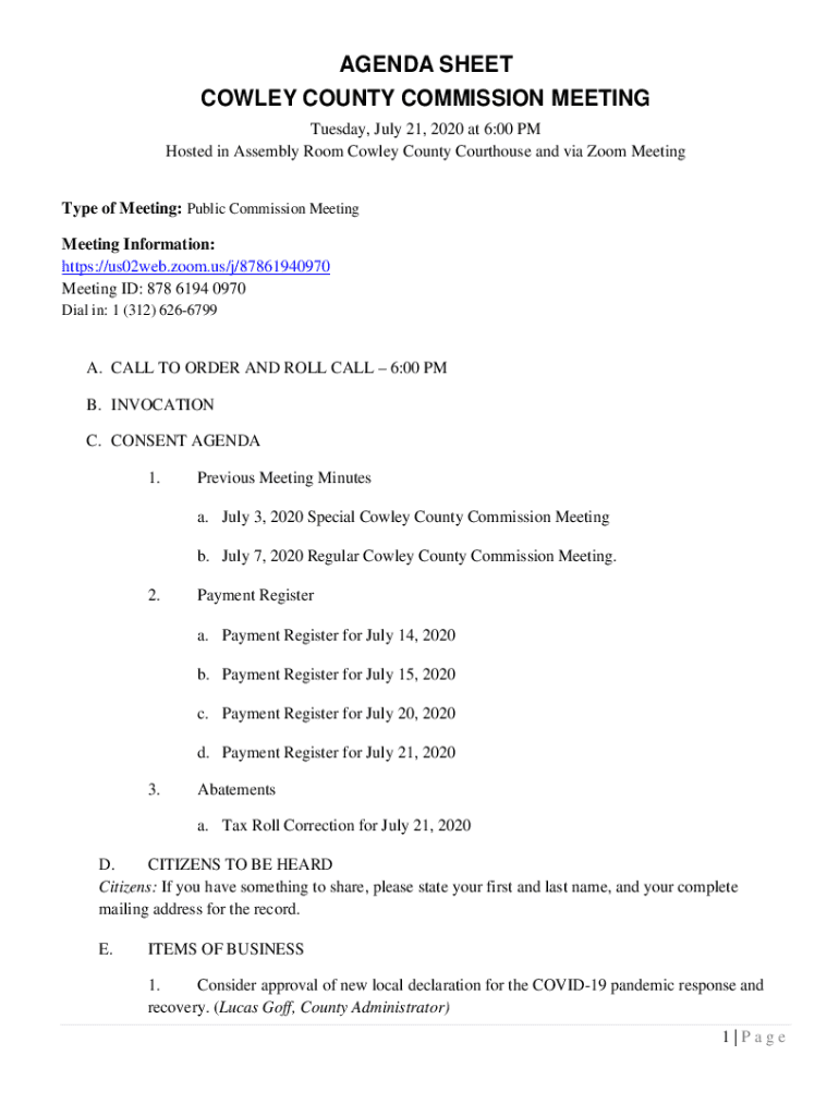 AGENDA SHEET COWLEY COUNTY COMMISSION MEETING Tuesday, July 21, 2020, at 6:00 PM Hosted in Assembly Room Cowley County Courthouse and via Zoom Meeting Type of Meeting: Public Commission Meeting Information: