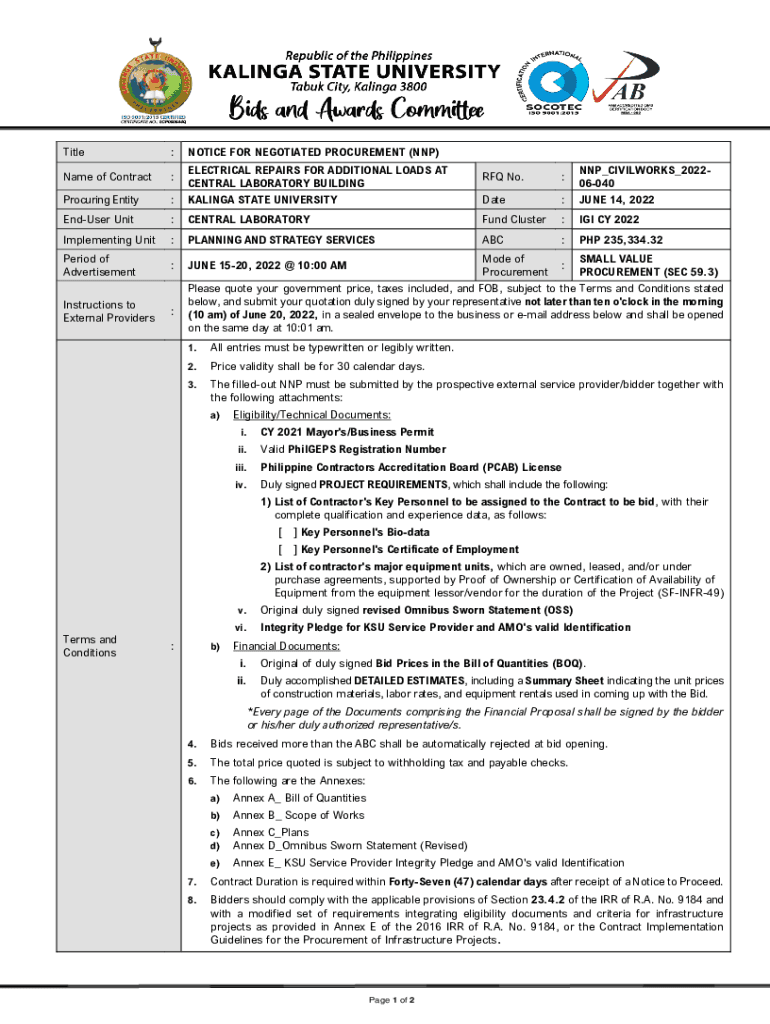 Title:NOTICE FOR NEGOTIATED PROCUREMENT (BNP)Name of Contract:ELECTRICAL REPAIRS FOR ADDITIONAL LOADS AT