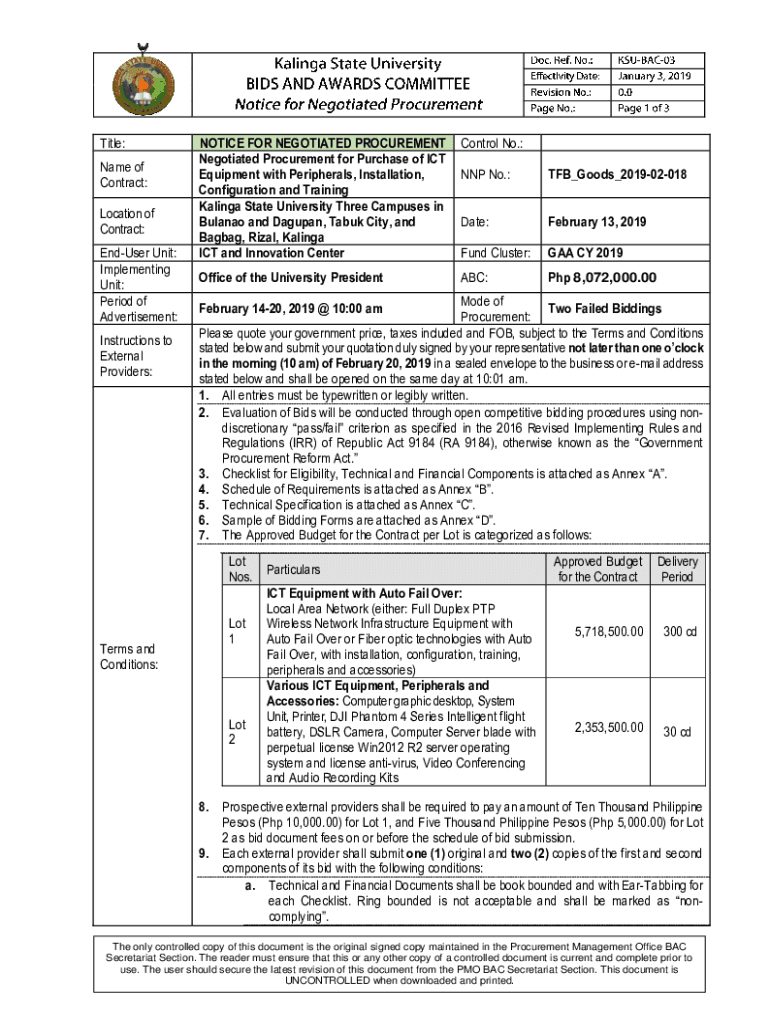 Conditions:NOTICE FOR NEGOTIATED PROCUREMENT for