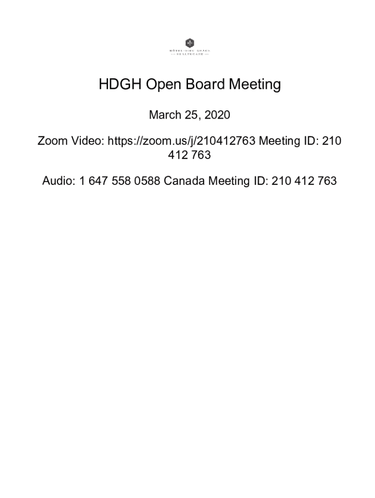 HIGH Open Board Meeting March 25, 2020, Zoom Video: https://zoom.us/j/210412763 Meeting ID: 210 412 763 Audio: 1 647 558 0588 Canada Meeting ID: 210 412 763March 25, 2020 HIGH Open Board Meeting Agenda