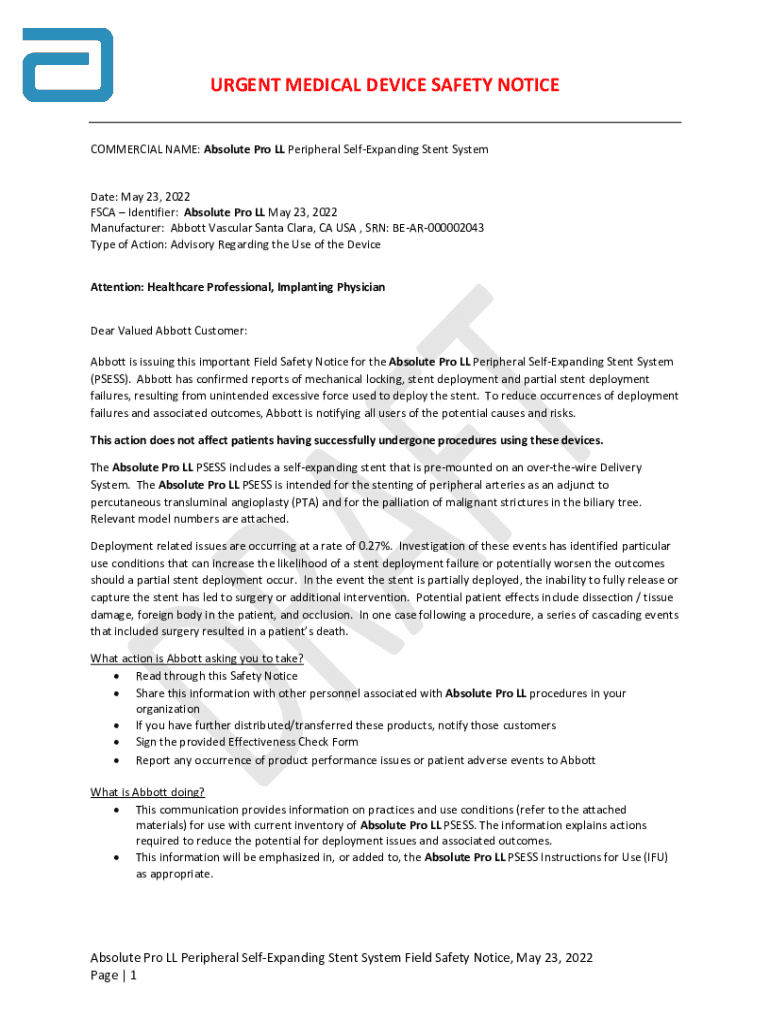 COMMERCIAL NAME: Absolute Pro LL Peripheral SelfExpanding Stent Systematic: May 23, 2022,