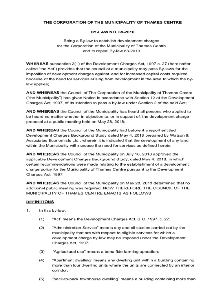 THE CORPORATION OF THE MUNICIPALITY OF THAMES Center BYLAW NO. 692018 Being a Bylaw to establish development charges for the Corporation of the Municipality of Thames Center and to repeal Bylaw 832013