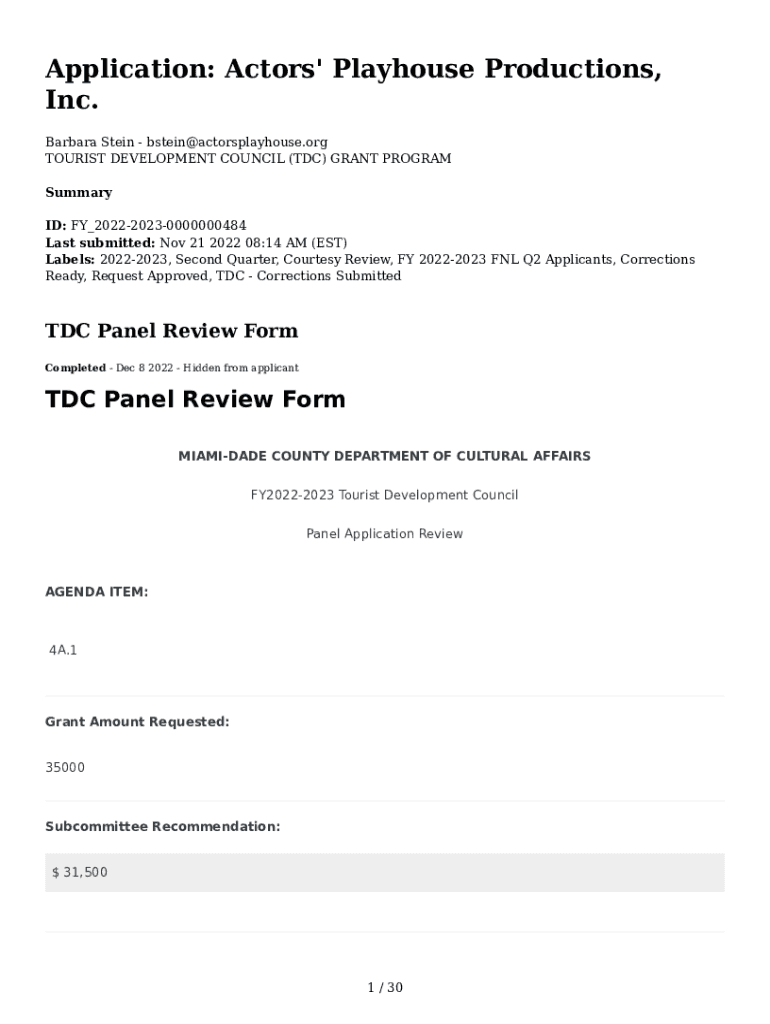 Application: Actors\' Playhouse Productions, Inc. Barbara Stein bstein@actorsplayhouse.org TOURIST DEVELOPMENT COUNCIL (TDC) GRANT PROGRAM Summary ID: FY_202220230000000484 Last submitted: Nov 21