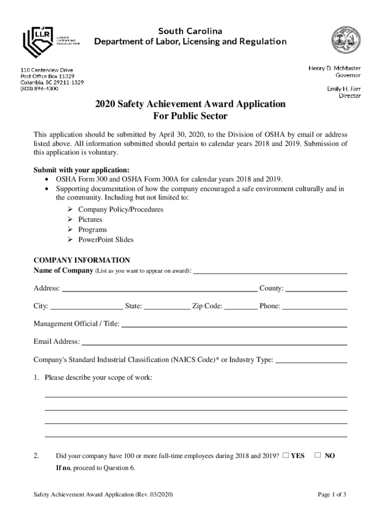 2020 Safety Achievement Award Application For Public Sector This application should be submitted by April 30, 2020, to the Division of OSHA by email or address listed above. All information submitted