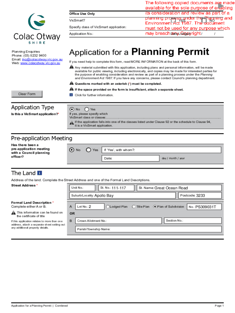 Office Use OnlyVicSmart?YESNOSpecify class of Smart application: Application No.:Planning Inquiries Phone: (03) 5232 9400 Email: inq@colacotway.vic.gov.au Web: www.colacotway.vic.gov.auDate Lodged:Application