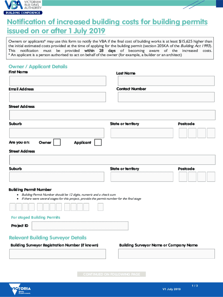 Notification of increased building costs for building permits issued on or after 1 July 2019 Owners or applicants* may use this form to notify the VBA if the final cost of building works is at least